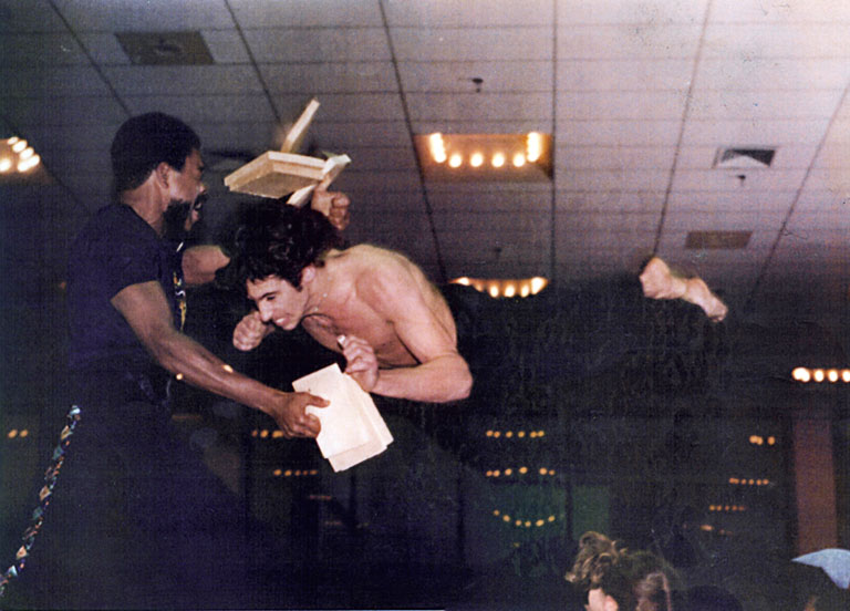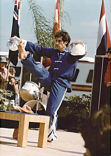 Dr. Pai gave me some special skills that I honed in the Pai Lum system. One—the flying head break. This skill is one of the most dangerous types of breaks. I trained my forehead like most people trained their hands in Iron Palm or Iron Hand skills, except I did not do a gravity break–one that uses downward force with gravity to break and object. My skill was to be airborne, fly over six to eight people (depending on the size of the stage or area used) who were sitting on all fours, and break four to five boards (without spacers) with just my forehead, then put down mylanding gear and roll out. There are many head breakers but no one, of whom I am aware, has done a flying head break with this same factor of difficulty to this day, except myself. The physics of all these factors makes this one of the most dangerous and unique martial art skills. You can easily break your neck or ribs upon landing. The most important lesson that I learned from this break was not to fear (overcome fearful thoughts). It taught me to be single minded and not to allow any negative feelings to enter my mind, because once you are airborne there is no turning back. Full committment was required. If I became fearful, I could land on someone's back below me, over whom I was flying.
