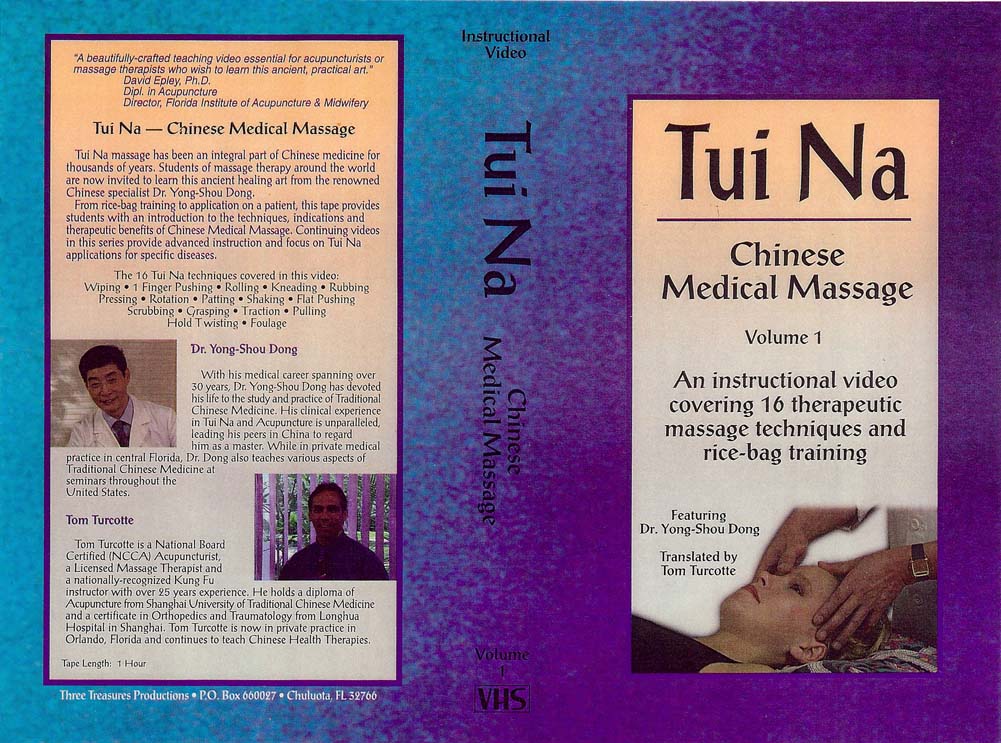This tape is scripted to teach rather than just demonstrate Tui Na. It demonstrates sixteen central Tui Na techniques with narration describing how to perform the technique. Accompanying graphics list the appropriate indications for use. These are stated in TCM terms, though some are provided with Western medical correspondences. Particular attention is paid to where and how each technique is best applied, the degrees of pressure, stimulus and expected bodily response. Importantly, the demonstration also shows how to achieve the strength and skill necessary to administer effective Tui Na. This is called "rice bag training" after the small, sewn bag of rice used for practice.
